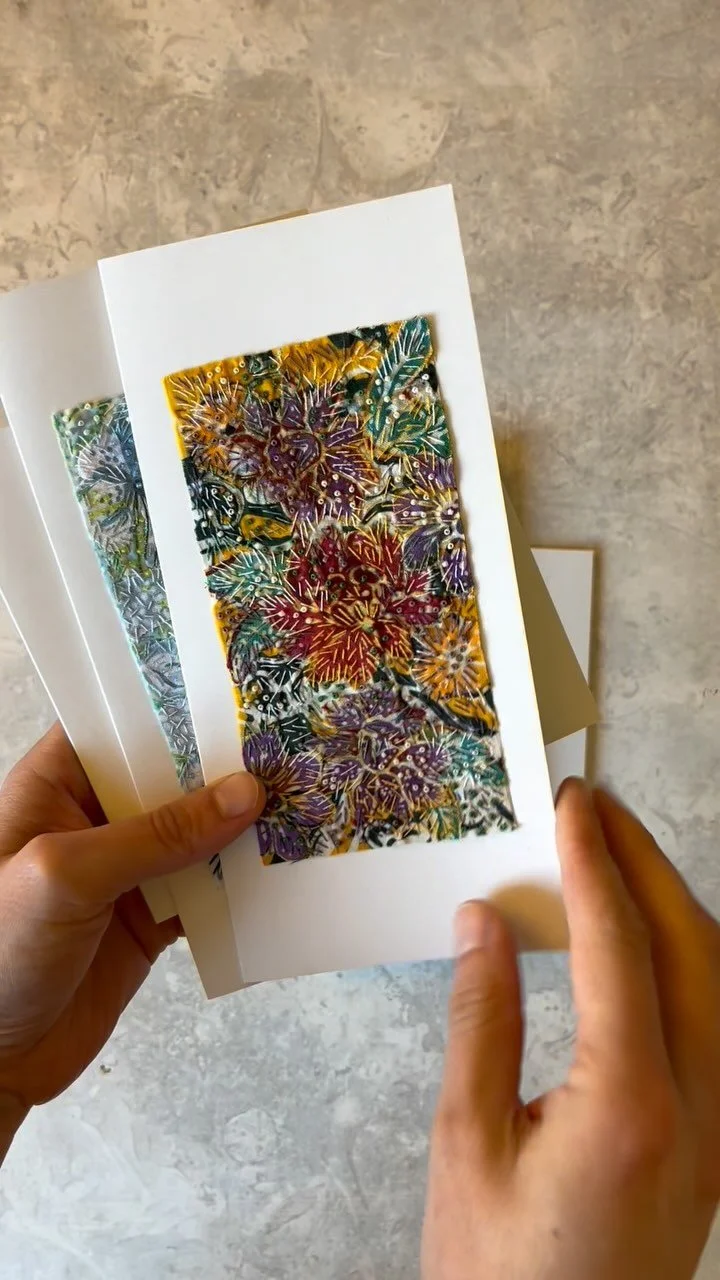 Each card features a unique hand stitched artwork by RAPPU. The panel is made using offcuts from our wraps, vintage cotton thread and Japanese glass beads. The cardstock is 100% recycled post consumer waste, and the back of the card is responsibly printed for us by print.work.